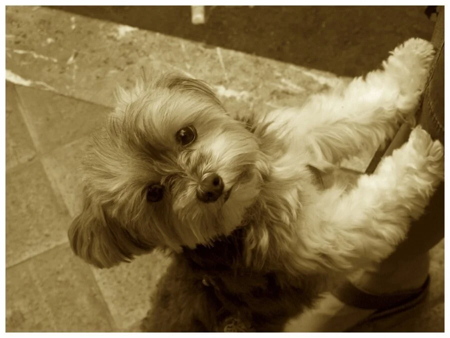 "But it is Roma Pierro-Wolf, a charismatic and utterly delightful furry white Morkie, who steals the show, without uttering a single word (or bark) onstage. Basically, all she needs to do is look out at the audience, or gaze adoringly into her co-stars eyes, or sink into a chair on her back demanding that her belly be scratched. She's got everyone in the house in the palm of her... paw. But do not think for one moment that Ms. Pierro-Wolf's presence in this rather bittersweet drama is a gimmick. She portrays Missy, who was the Wolf family's dog at the time of the events depicted in this play. And her characterization—and more to the point, her character—is spot-on in this piece."